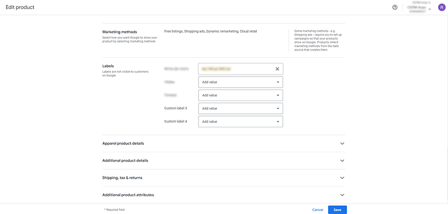 - Select one of the available fields (e.g. Custom label 0, Custom label 1, to Custom label 4) and enter the label value you need, such as “season”, “popular”, “discount”, etc.