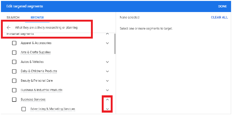 - Intent segments: Target users who have shown a specific interest or intention, such as purchasing a product or registering on a website.